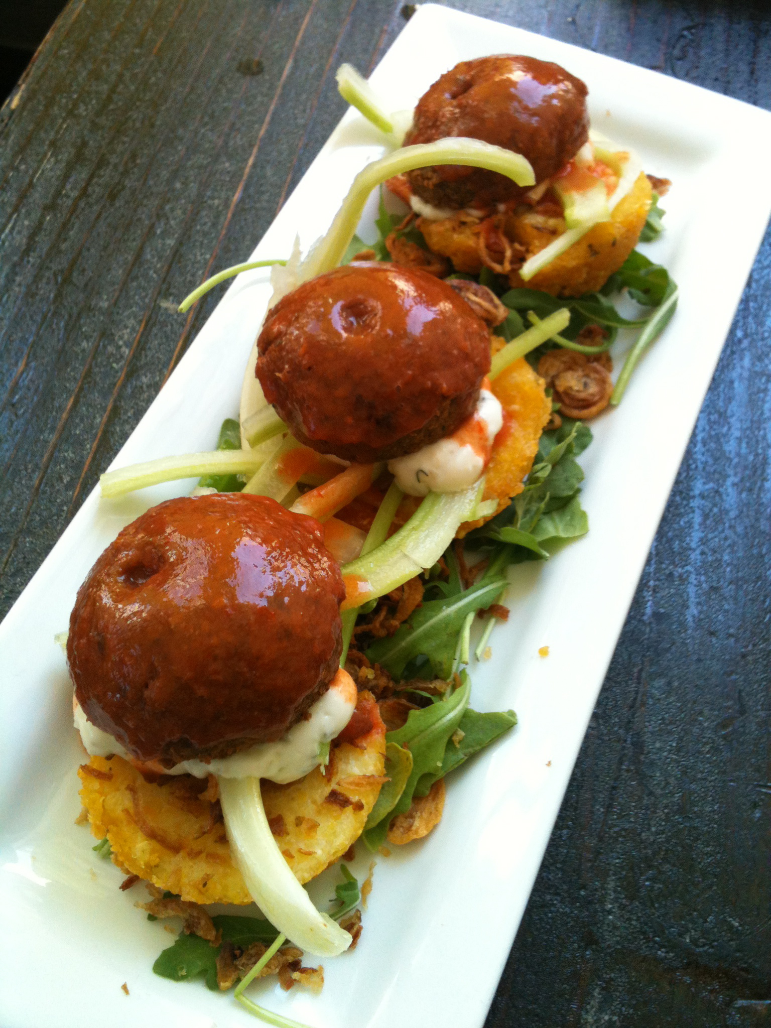 We also got an appetizer, the “Buffalo Croquettes” — three falafel balls tossed in buffalo sauce atop sage polenta, crispy onions, arugula and creamy horseradish sauce. Of all the big ticket items I tried in my two visits to Sage, this might have been the item I liked least. Their falafel was a bit on the dry side and wasn’t nearly as good as Sunnin or Habayit, and I didn’t love the combination of the dry falafel with the dry polenta. But hey, at a place as good as Sage, I’m determined to eventually try everything.