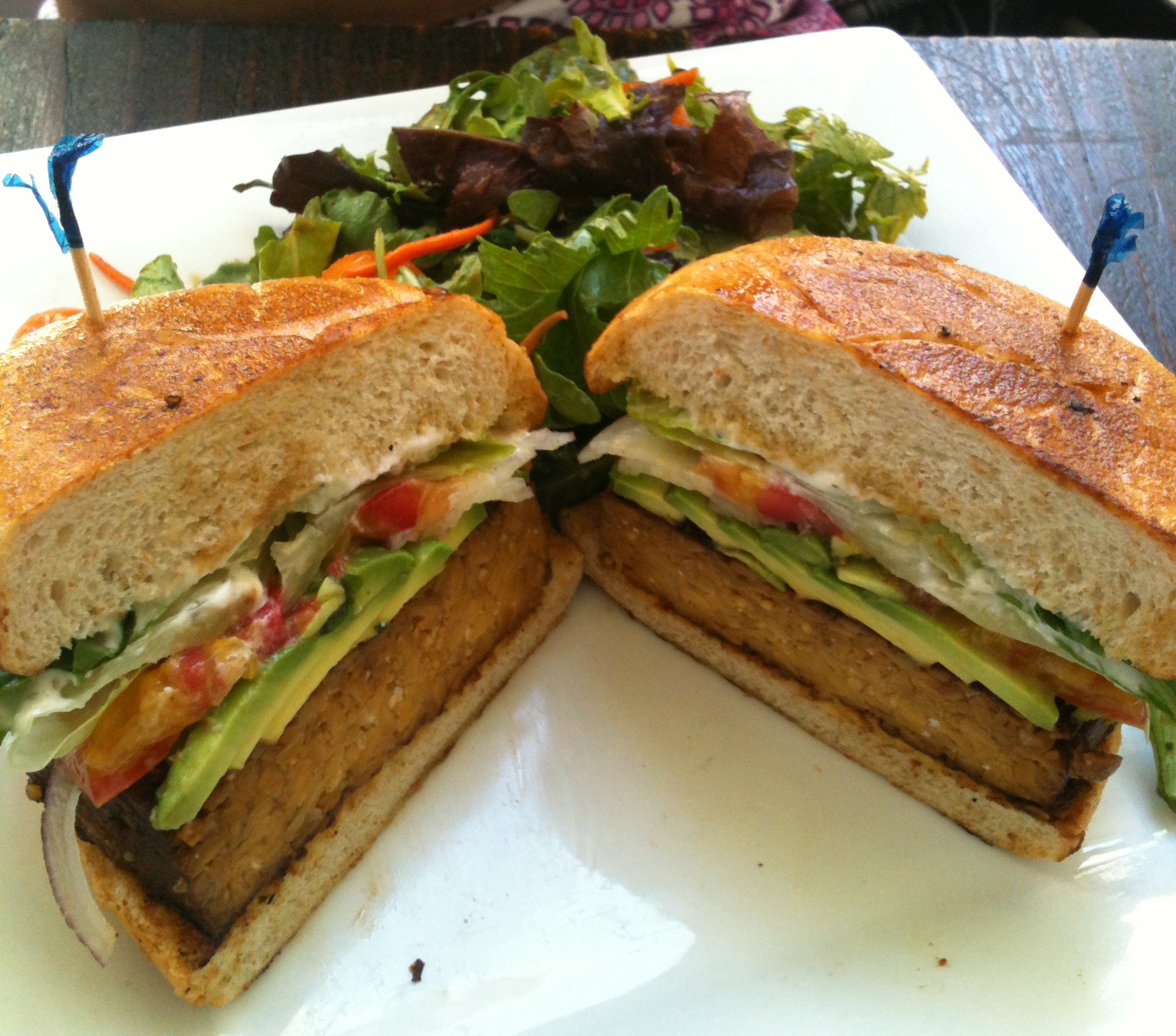 Okay, if you don’t live in SoCal you might not care about all that, but maybe you will care about the food. So let’s get to it! Ms. Insufferable and I split two burgers, and they were both good. One was their “Classic Tempeh Burger” which as you can see comes with a HUGE block of tempeh. This seems like maybe the equivalent of five or six of the tempeh patties they give you on a Native Foods Scorpion Burger! Just massive. And it had a bright, citrusy taste to it even though the menu description of lettuce, tomato, avocado, mayo, mustard and onion didn’t lead me to expect that type of taste.